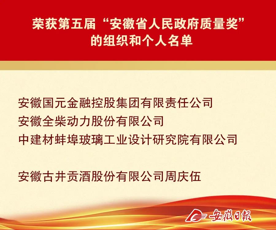 據(jù)省市場(chǎng)監(jiān)管局消息,省政府日前印發(fā)《關(guān)于第五屆“安徽省人民政府質(zhì)量獎(jiǎng)”的通報(bào)》,安徽國(guó)元金融控股集團(tuán)有限責(zé)任公司、安徽全柴動(dòng)力股份有限公司、中建材蚌埠玻璃工業(yè)設(shè)計(jì)研究院有限公司等3家組織和安徽古井貢酒股份有限公司周慶伍1名個(gè)人榮獲第五屆“安徽省人民政府質(zhì)量獎(jiǎng)”。合肥市第一人民醫(yī)院等8家組織和淮北礦業(yè)(集團(tuán))有限責(zé)任公司楊杰等2名個(gè)人榮獲“提名獎(jiǎng)”。