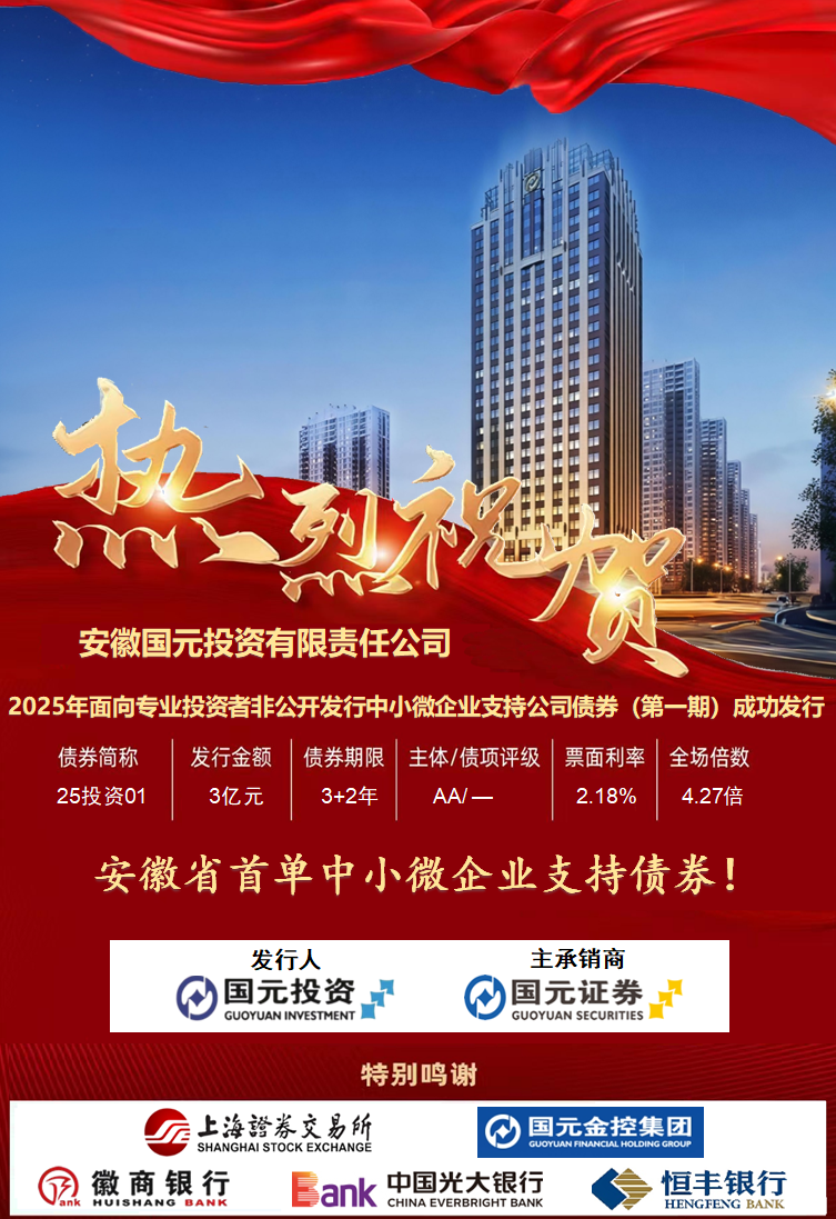 2025年5月28日,在國元金控集團(tuán)的大力支持下,國元投資2025年面向?qū)I(yè)投資者非公開發(fā)行中小微企業(yè)支持公司債券(第一期)在上海證券交易所成功發(fā)行。發(fā)行規(guī)模3億元人民幣,期限3+2年,票面利率2.18%,由國元金控集團(tuán)提供擔(dān)保,主承銷商國元證券,托管機(jī)構(gòu)華安證券。本期債券為安徽省首單中小微企業(yè)支持債券,不僅填補(bǔ)了安徽省中小微企業(yè)支持債券的空白,更標(biāo)志著安徽省屬國有企業(yè)在運(yùn)用創(chuàng)新金融工具服務(wù)實(shí)體經(jīng)濟(jì)、落實(shí)普惠金融戰(zhàn)略上的重大突破。