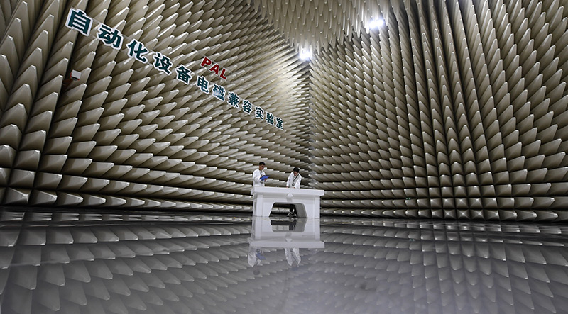 在南瑞集團有限公司自動化設備電磁兼容實驗室,科研人員在進行輻射發射實驗準備工作(2023年7月7日攝)。新華社記者 季春鵬 攝