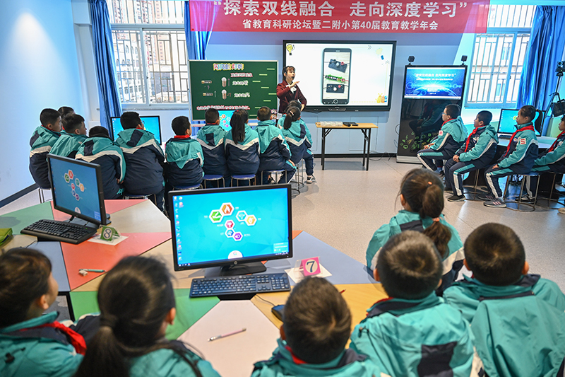 福州教育學(xué)院附屬第二小學(xué)的學(xué)生在由學(xué)校與網(wǎng)龍網(wǎng)絡(luò)公司共同打造的“創(chuàng)客教室”學(xué)習(xí)科學(xué)課(2020年12月18日攝)。新華社記者 宋為偉 攝