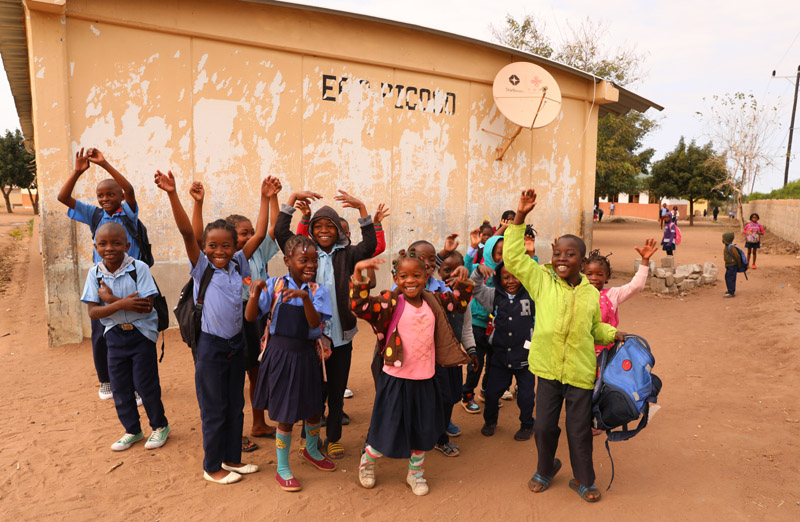 2023年7月25日,莫桑比克馬普托省皮科科村學校的孩子們站在裝有中國援助的衛星電視接收天線的房屋前。新華社記者 董江輝 攝