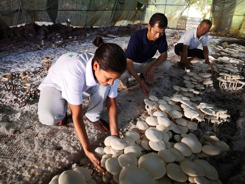 2018年6月12日,在斐濟楠迪,中國專家和當地雇員在檢查菌菇生長情況。新華社記者 張永興 攝